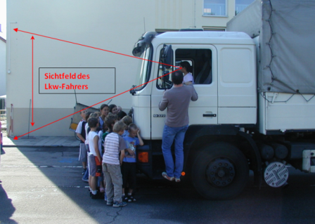 Treffen zu Fuß Gehende oder Radfahrende mit Lastkraftwagen oder Bussen zusammen, haben sie häufig das Nachsehen. Ein wesentliches Problem hierbei ist der sogenannte "Tote Winkel". Dieser entsteht, weil der Lkw-Fahrer nach hinten in aller Regel nur mit seinen Außenspiegeln "sehen" kann. Trotz zweier solcher Außenspiegel an jeder Seite gibt es aber bestimmte Flächen vor allem neben dem Lkw, die für den Lkw-Fahrer einfach nicht einsehbar sein können. Deshalb verschwinden oftmals zu Fuß Gehende und Radfahrende, wenn sie sich neben dem Lkw aufhalten oder so an ihm vorbeifahren wollen.